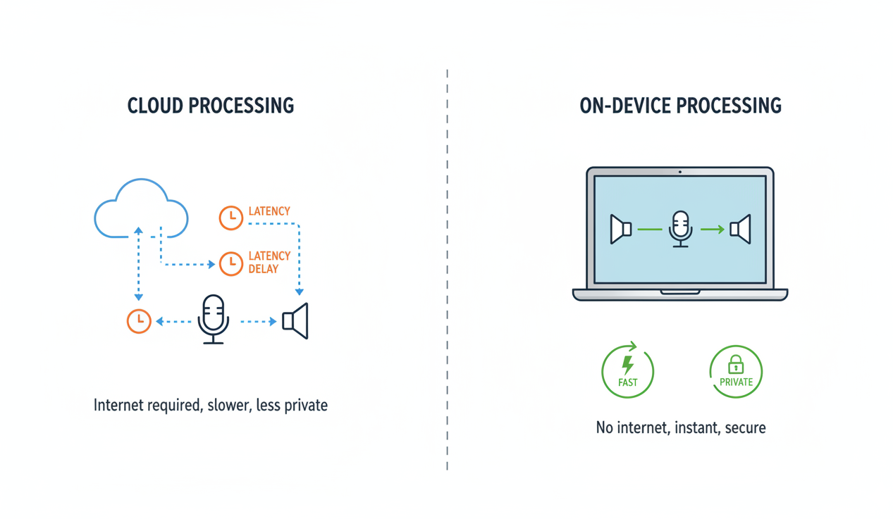 On-device solutions take a different approach by processing everything locally. This makes dictation faster and more responsive, removes the need for an internet connection, and keeps your data private - all of which contribute to a much smoother and more consistent workflow.