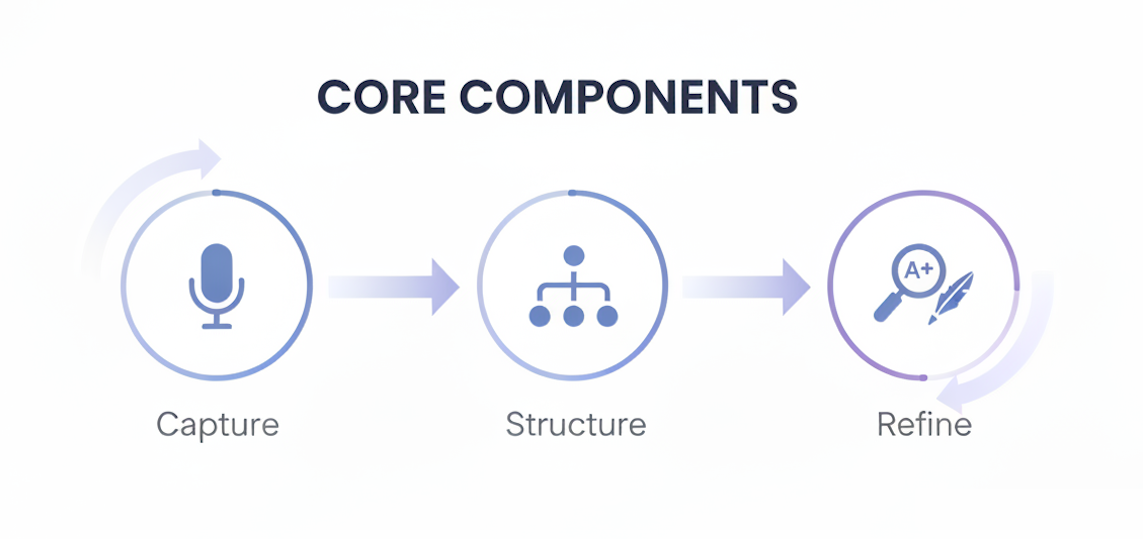 A strong voice input workflow isn’t just about using speech-to-text - it’s about how you structure the process around it. Most effective workflows follow a simple pattern: capture ideas quickly, shape them loosely, and refine them afterward.